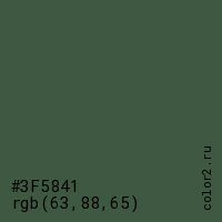 Цвет #3F5841 в цветовой модели RGB обозначается тремя октетами (63, 88, 65) в десятичном формате и #3F5841 в шестнадцатиричном (hex) формате, которые являются интенсивностью красного 63 (hex 3F), интенсивность зелёного 88 (hex 58) и интенсивность синего 65 (hex 41).