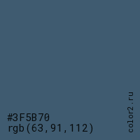 Цвет #3F5B70 в цветовой модели RGB обозначается тремя октетами (63, 91, 112) в десятичном формате и #3F5B70 в шестнадцатиричном (hex) формате, которые являются интенсивностью красного 63 (hex 3F), интенсивность зелёного 91 (hex 5B) и интенсивность синего 112 (hex 70).