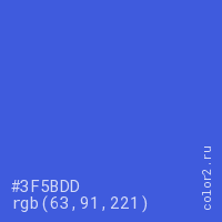 Цвет RGB(63, 91, 221) в процентом отношении количества цвета состоит из 24.7% красного (red), 35.7% зелёного (green) и 86.7% синего (blue).