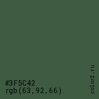Цвет #3F5C42 в цветовой модели RGB обозначается тремя октетами (63, 92, 66) в десятичном формате и #3F5C42 в шестнадцатиричном (hex) формате, которые являются интенсивностью красного 63 (hex 3F), интенсивность зелёного 92 (hex 5C) и интенсивность синего 66 (hex 42).