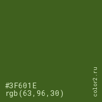 Цвет #3F601E в цветовой модели RGB обозначается тремя октетами (63, 96, 30) в десятичном формате и #3F601E в шестнадцатиричном (hex) формате, которые являются интенсивностью красного 63 (hex 3F), интенсивность зелёного 96 (hex 60) и интенсивность синего 30 (hex 1E).