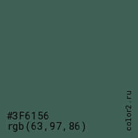 Цвет #3F6156 в цветовой модели RGB обозначается тремя октетами (63, 97, 86) в десятичном формате и #3F6156 в шестнадцатиричном (hex) формате, которые являются интенсивностью красного 63 (hex 3F), интенсивность зелёного 97 (hex 61) и интенсивность синего 86 (hex 56).