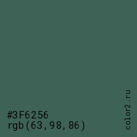 Цвет #3F6256 в цветовой модели RGB обозначается тремя октетами (63, 98, 86) в десятичном формате и #3F6256 в шестнадцатиричном (hex) формате, которые являются интенсивностью красного 63 (hex 3F), интенсивность зелёного 98 (hex 62) и интенсивность синего 86 (hex 56).