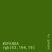 Цвет #3F680A в цветовой модели RGB обозначается тремя октетами (63, 104, 10) в десятичном формате и #3F680A в шестнадцатиричном (hex) формате, которые являются интенсивностью красного 63 (hex 3F), интенсивность зелёного 104 (hex 68) и интенсивность синего 10 (hex 0A).