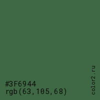 Цвет #3F6944 в цветовой модели RGB обозначается тремя октетами (63, 105, 68) в десятичном формате и #3F6944 в шестнадцатиричном (hex) формате, которые являются интенсивностью красного 63 (hex 3F), интенсивность зелёного 105 (hex 69) и интенсивность синего 68 (hex 44).