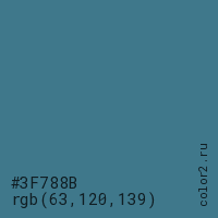 Цвет #3F788B в цветовой модели RGB обозначается тремя октетами (63, 120, 139) в десятичном формате и #3F788B в шестнадцатиричном (hex) формате, которые являются интенсивностью красного 63 (hex 3F), интенсивность зелёного 120 (hex 78) и интенсивность синего 139 (hex 8B).