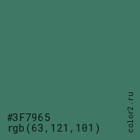 Цвет #3F7965 в цветовой модели RGB обозначается тремя октетами (63, 121, 101) в десятичном формате и #3F7965 в шестнадцатиричном (hex) формате, которые являются интенсивностью красного 63 (hex 3F), интенсивность зелёного 121 (hex 79) и интенсивность синего 101 (hex 65).