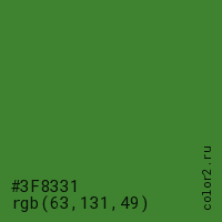 Цвет #3F8331 в цветовой модели RGB обозначается тремя октетами (63, 131, 49) в десятичном формате и #3F8331 в шестнадцатиричном (hex) формате, которые являются интенсивностью красного 63 (hex 3F), интенсивность зелёного 131 (hex 83) и интенсивность синего 49 (hex 31).