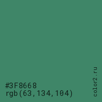 Цвет #3F8668 в цветовой модели RGB обозначается тремя октетами (63, 134, 104) в десятичном формате и #3F8668 в шестнадцатиричном (hex) формате, которые являются интенсивностью красного 63 (hex 3F), интенсивность зелёного 134 (hex 86) и интенсивность синего 104 (hex 68).