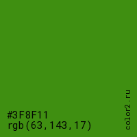 Цвет #3F8F11 в цветовой модели RGB обозначается тремя октетами (63, 143, 17) в десятичном формате и #3F8F11 в шестнадцатиричном (hex) формате, которые являются интенсивностью красного 63 (hex 3F), интенсивность зелёного 143 (hex 8F) и интенсивность синего 17 (hex 11).