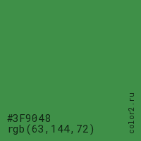 Цвет #3F9048 в цветовой модели RGB обозначается тремя октетами (63, 144, 72) в десятичном формате и #3F9048 в шестнадцатиричном (hex) формате, которые являются интенсивностью красного 63 (hex 3F), интенсивность зелёного 144 (hex 90) и интенсивность синего 72 (hex 48).