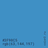 Цвет #3F90C5 в цветовой модели RGB обозначается тремя октетами (63, 144, 197) в десятичном формате и #3F90C5 в шестнадцатиричном (hex) формате, которые являются интенсивностью красного 63 (hex 3F), интенсивность зелёного 144 (hex 90) и интенсивность синего 197 (hex C5).
