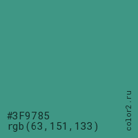 Цвет #3F9785 в цветовой модели RGB обозначается тремя октетами (63, 151, 133) в десятичном формате и #3F9785 в шестнадцатиричном (hex) формате, которые являются интенсивностью красного 63 (hex 3F), интенсивность зелёного 151 (hex 97) и интенсивность синего 133 (hex 85).