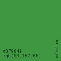 Цвет #3F9841 в цветовой модели RGB обозначается тремя октетами (63, 152, 65) в десятичном формате и #3F9841 в шестнадцатиричном (hex) формате, которые являются интенсивностью красного 63 (hex 3F), интенсивность зелёного 152 (hex 98) и интенсивность синего 65 (hex 41).