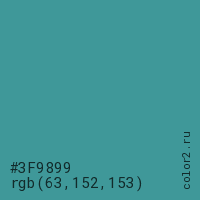 Цвет #3F9899 в цветовой модели RGB обозначается тремя октетами (63, 152, 153) в десятичном формате и #3F9899 в шестнадцатиричном (hex) формате, которые являются интенсивностью красного 63 (hex 3F), интенсивность зелёного 152 (hex 98) и интенсивность синего 153 (hex 99).