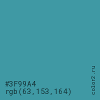 Цвет #3F99A4 в цветовой модели RGB обозначается тремя октетами (63, 153, 164) в десятичном формате и #3F99A4 в шестнадцатиричном (hex) формате, которые являются интенсивностью красного 63 (hex 3F), интенсивность зелёного 153 (hex 99) и интенсивность синего 164 (hex A4).