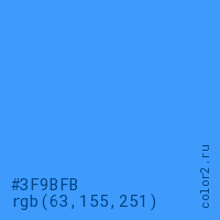 Цвет #3F9BFB в цветовой модели RGB обозначается тремя октетами (63, 155, 251) в десятичном формате и #3F9BFB в шестнадцатиричном (hex) формате, которые являются интенсивностью красного 63 (hex 3F), интенсивность зелёного 155 (hex 9B) и интенсивность синего 251 (hex FB).