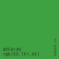 Цвет #3FA142 в цветовой модели RGB обозначается тремя октетами (63, 161, 66) в десятичном формате и #3FA142 в шестнадцатиричном (hex) формате, которые являются интенсивностью красного 63 (hex 3F), интенсивность зелёного 161 (hex A1) и интенсивность синего 66 (hex 42).