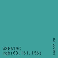 Цвет #3FA19C в цветовой модели RGB обозначается тремя октетами (63, 161, 156) в десятичном формате и #3FA19C в шестнадцатиричном (hex) формате, которые являются интенсивностью красного 63 (hex 3F), интенсивность зелёного 161 (hex A1) и интенсивность синего 156 (hex 9C).