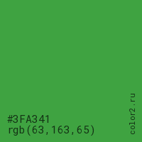 Цвет #3FA341 в цветовой модели RGB обозначается тремя октетами (63, 163, 65) в десятичном формате и #3FA341 в шестнадцатиричном (hex) формате, которые являются интенсивностью красного 63 (hex 3F), интенсивность зелёного 163 (hex A3) и интенсивность синего 65 (hex 41).