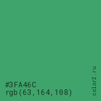 Цвет #3FA46C в цветовой модели RGB обозначается тремя октетами (63, 164, 108) в десятичном формате и #3FA46C в шестнадцатиричном (hex) формате, которые являются интенсивностью красного 63 (hex 3F), интенсивность зелёного 164 (hex A4) и интенсивность синего 108 (hex 6C).