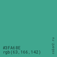 Цвет #3FA68E в цветовой модели RGB обозначается тремя октетами (63, 166, 142) в десятичном формате и #3FA68E в шестнадцатиричном (hex) формате, которые являются интенсивностью красного 63 (hex 3F), интенсивность зелёного 166 (hex A6) и интенсивность синего 142 (hex 8E).