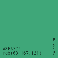 Цвет #3FA779 в цветовой модели RGB обозначается тремя октетами (63, 167, 121) в десятичном формате и #3FA779 в шестнадцатиричном (hex) формате, которые являются интенсивностью красного 63 (hex 3F), интенсивность зелёного 167 (hex A7) и интенсивность синего 121 (hex 79).