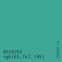 Цвет #3FA795 в цветовой модели RGB обозначается тремя октетами (63, 167, 149) в десятичном формате и #3FA795 в шестнадцатиричном (hex) формате, которые являются интенсивностью красного 63 (hex 3F), интенсивность зелёного 167 (hex A7) и интенсивность синего 149 (hex 95).
