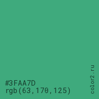 Цвет #3FAA7D в цветовой модели RGB обозначается тремя октетами (63, 170, 125) в десятичном формате и #3FAA7D в шестнадцатиричном (hex) формате, которые являются интенсивностью красного 63 (hex 3F), интенсивность зелёного 170 (hex AA) и интенсивность синего 125 (hex 7D).