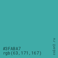 Цвет #3FABA7 в цветовой модели RGB обозначается тремя октетами (63, 171, 167) в десятичном формате и #3FABA7 в шестнадцатиричном (hex) формате, которые являются интенсивностью красного 63 (hex 3F), интенсивность зелёного 171 (hex AB) и интенсивность синего 167 (hex A7).