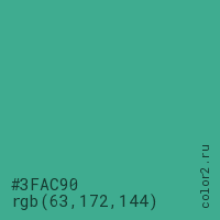 Цвет #3FAC90 в цветовой модели RGB обозначается тремя октетами (63, 172, 144) в десятичном формате и #3FAC90 в шестнадцатиричном (hex) формате, которые являются интенсивностью красного 63 (hex 3F), интенсивность зелёного 172 (hex AC) и интенсивность синего 144 (hex 90).