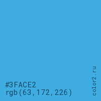 Цвет #3FACE2 в цветовой модели RGB обозначается тремя октетами (63, 172, 226) в десятичном формате и #3FACE2 в шестнадцатиричном (hex) формате, которые являются интенсивностью красного 63 (hex 3F), интенсивность зелёного 172 (hex AC) и интенсивность синего 226 (hex E2).