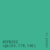 Цвет #3FB292 в цветовой модели RGB обозначается тремя октетами (63, 178, 146) в десятичном формате и #3FB292 в шестнадцатиричном (hex) формате, которые являются интенсивностью красного 63 (hex 3F), интенсивность зелёного 178 (hex B2) и интенсивность синего 146 (hex 92).