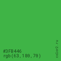 Цвет #3FB446 в цветовой модели RGB обозначается тремя октетами (63, 180, 70) в десятичном формате и #3FB446 в шестнадцатиричном (hex) формате, которые являются интенсивностью красного 63 (hex 3F), интенсивность зелёного 180 (hex B4) и интенсивность синего 70 (hex 46).