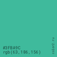 Цвет #3FBA9C в цветовой модели RGB обозначается тремя октетами (63, 186, 156) в десятичном формате и #3FBA9C в шестнадцатиричном (hex) формате, которые являются интенсивностью красного 63 (hex 3F), интенсивность зелёного 186 (hex BA) и интенсивность синего 156 (hex 9C).