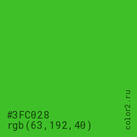 Цвет #3FC028 в цветовой модели RGB обозначается тремя октетами (63, 192, 40) в десятичном формате и #3FC028 в шестнадцатиричном (hex) формате, которые являются интенсивностью красного 63 (hex 3F), интенсивность зелёного 192 (hex C0) и интенсивность синего 40 (hex 28).