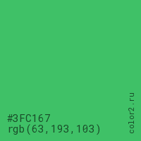 Цвет #3FC167 в цветовой модели RGB обозначается тремя октетами (63, 193, 103) в десятичном формате и #3FC167 в шестнадцатиричном (hex) формате, которые являются интенсивностью красного 63 (hex 3F), интенсивность зелёного 193 (hex C1) и интенсивность синего 103 (hex 67).