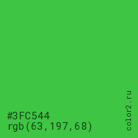 Цвет #3FC544 в цветовой модели RGB обозначается тремя октетами (63, 197, 68) в десятичном формате и #3FC544 в шестнадцатиричном (hex) формате, которые являются интенсивностью красного 63 (hex 3F), интенсивность зелёного 197 (hex C5) и интенсивность синего 68 (hex 44).
