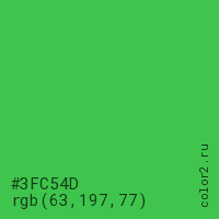Цвет #3FC54D в цветовой модели RGB обозначается тремя октетами (63, 197, 77) в десятичном формате и #3FC54D в шестнадцатиричном (hex) формате, которые являются интенсивностью красного 63 (hex 3F), интенсивность зелёного 197 (hex C5) и интенсивность синего 77 (hex 4D).