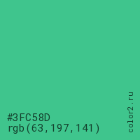 Цвет #3FC58D в цветовой модели RGB обозначается тремя октетами (63, 197, 141) в десятичном формате и #3FC58D в шестнадцатиричном (hex) формате, которые являются интенсивностью красного 63 (hex 3F), интенсивность зелёного 197 (hex C5) и интенсивность синего 141 (hex 8D).