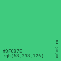 Цвет #3FCB7E в цветовой модели RGB обозначается тремя октетами (63, 203, 126) в десятичном формате и #3FCB7E в шестнадцатиричном (hex) формате, которые являются интенсивностью красного 63 (hex 3F), интенсивность зелёного 203 (hex CB) и интенсивность синего 126 (hex 7E).