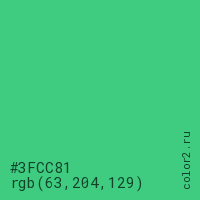Цвет #3FCC81 в цветовой модели RGB обозначается тремя октетами (63, 204, 129) в десятичном формате и #3FCC81 в шестнадцатиричном (hex) формате, которые являются интенсивностью красного 63 (hex 3F), интенсивность зелёного 204 (hex CC) и интенсивность синего 129 (hex 81).