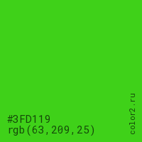 Цвет #3FD119 в цветовой модели RGB обозначается тремя октетами (63, 209, 25) в десятичном формате и #3FD119 в шестнадцатиричном (hex) формате, которые являются интенсивностью красного 63 (hex 3F), интенсивность зелёного 209 (hex D1) и интенсивность синего 25 (hex 19).
