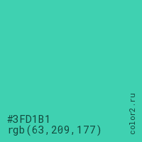 Цвет #3FD1B1 в цветовой модели RGB обозначается тремя октетами (63, 209, 177) в десятичном формате и #3FD1B1 в шестнадцатиричном (hex) формате, которые являются интенсивностью красного 63 (hex 3F), интенсивность зелёного 209 (hex D1) и интенсивность синего 177 (hex B1).