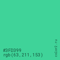 Цвет #3FD399 в цветовой модели RGB обозначается тремя октетами (63, 211, 153) в десятичном формате и #3FD399 в шестнадцатиричном (hex) формате, которые являются интенсивностью красного 63 (hex 3F), интенсивность зелёного 211 (hex D3) и интенсивность синего 153 (hex 99).