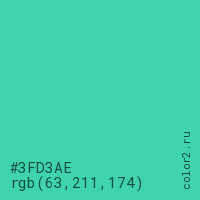 Цвет #3FD3AE в цветовой модели RGB обозначается тремя октетами (63, 211, 174) в десятичном формате и #3FD3AE в шестнадцатиричном (hex) формате, которые являются интенсивностью красного 63 (hex 3F), интенсивность зелёного 211 (hex D3) и интенсивность синего 174 (hex AE).