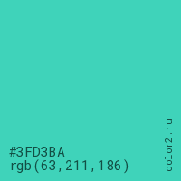 Цвет #3FD3BA в цветовой модели RGB обозначается тремя октетами (63, 211, 186) в десятичном формате и #3FD3BA в шестнадцатиричном (hex) формате, которые являются интенсивностью красного 63 (hex 3F), интенсивность зелёного 211 (hex D3) и интенсивность синего 186 (hex BA).
