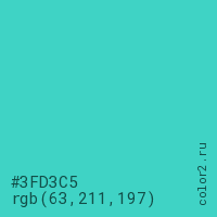 Цвет #3FD3C5 в цветовой модели RGB обозначается тремя октетами (63, 211, 197) в десятичном формате и #3FD3C5 в шестнадцатиричном (hex) формате, которые являются интенсивностью красного 63 (hex 3F), интенсивность зелёного 211 (hex D3) и интенсивность синего 197 (hex C5).