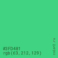 Цвет #3FD481 в цветовой модели RGB обозначается тремя октетами (63, 212, 129) в десятичном формате и #3FD481 в шестнадцатиричном (hex) формате, которые являются интенсивностью красного 63 (hex 3F), интенсивность зелёного 212 (hex D4) и интенсивность синего 129 (hex 81).