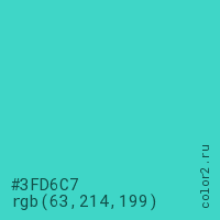 Цвет #3FD6C7 в цветовой модели RGB обозначается тремя октетами (63, 214, 199) в десятичном формате и #3FD6C7 в шестнадцатиричном (hex) формате, которые являются интенсивностью красного 63 (hex 3F), интенсивность зелёного 214 (hex D6) и интенсивность синего 199 (hex C7).
